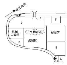 2、综合题 把图5—12中英文字母填入下面表格中(每个空格只填一个字母,每个字母只限填一次),使城市功能分区合理化。