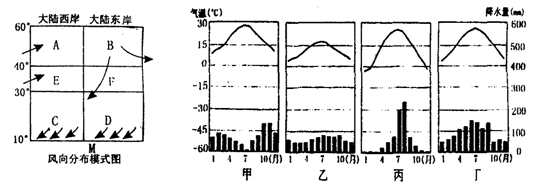 (4)E、F同为300N~400N的大陆, E的气候类型是_______________,F的气候类型是______________,两地的气候截然不同,原因是