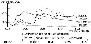 1、单选题 一种物质所产生的自身辐射或对外来辐射所产生的反射和透射,形成了该物质的一种特殊标志——波谱特征。如图显示了松林、草地、红砂岩和泥浆的反射波谱曲线,读图回答问题。