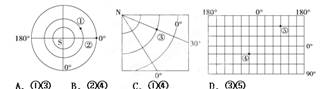 5、单选题 读“三幅经纬网示意图”,图中①~⑤各地,地理坐标可能相同的是