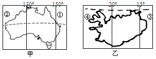【小题1】根据图中经纬度位置和轮廓可知,甲为澳大利亚,乙地为冰岛。甲地位于南半球,乙地地跨东西半球;甲地邻近太平洋和印度洋,乙地位于大西洋;甲地位于中低纬度,乙地位于高纬度地区,海域水温差异大;甲地为热带和亚热带景观,乙地为温带景观。