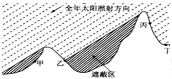 本题解析:由图可知甲地位于乙地的正南方且处于遮蔽区可推断出该区域位于南半球,12月22日太阳直射点在南回归线(23°26′S)。若该区域位于南纬20°附近的话则甲处为阳坡不符合题意,只能选B。