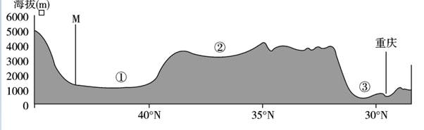 1、单选题 读下图“M地—-—重庆地形剖面示意图”。图中①、②、③三个地形区都是大型盆地地形,回答下列各题。