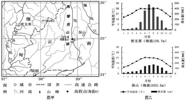 3、单选题  高黎贡山脉两侧自然景观差异显著。图甲为高黎贡山脉南段两侧部分区域略图,本区域山地冰川的雪线海拔高度在4 800 m左右,图乙为图甲中密支那和保山的气候统计图。读图,完成下列小题。