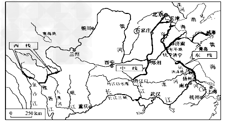 4、单选题 图为南水北调工程线路示意图,读图完成1~2题。