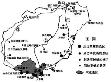 (2)从海口到三亚景区的①、②、③三条线路中,___________线路最受欢迎,原因是___________________________________________________(4分)
