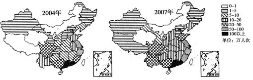 1、单选题  随着海峡两岸联系的不断增强,台胞游客对大陆旅游市场的影响与日俱增。下图为2004年和2007年台胞游客分布示意图。据图回答题。