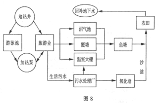 1、单选题  北京蟹岛集团是一家集生态农业与旅游观光为一体的大型企业。图8为“蟹島水循环利用示 意图”。读图完成21~22题。