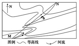 小题2:河流分布在河谷中,故等高线应为“凸高为低”,故a位于上游,b位于下游;即M地势高于N。图
