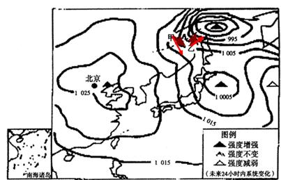 【小题2】根据图中等压线分析,北京受高压控制,同时未来24小时强度增强,晴朗天气为主,排除A;根据风向的判断原理,广东省受东北风影响,排除B;图中朝鲜受高压控制,且不断增强,故风力不断增强,排除C;日本列岛受低压控制,同时在加强,使得与控制北京的高压中心气压梯度不断增大,风力增强,选D。