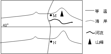 【小题2】图示大陆西岸的40度纬线附近,有温带海洋性气候和地中海气候的地区是南美洲西部;图中山脉是安第斯山,是美洲板块与南极洲板块碰撞挤压形成的;图中河流在地中海气候区,径流的季节变化大;M地中海气候,对应亚热带常绿硬叶林带,N地温带海洋性气候,对应温带落叶阔叶林带;图中陆地上等温线发生弯曲,主要是安第斯山的影响。选D正确。