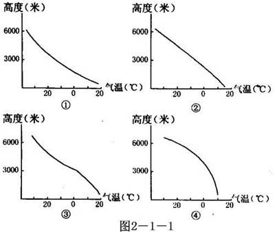 本题解析:对流层的上升气流会使飞行中的飞机颠簸,要使飞机平稳飞行,必须使气流平稳。读图计算比较:①图5 000米高空气温理论值应为-10℃,而实际气温约为-30℃,②图5000米高空气温理论值应为-15℃,而实际气温约为-20℃,③图5 000米高空气温理论值为-10℃,而实际气温约为-25℃,④图5000米高空气温理论值为-20℃,而实际气温也约为-20℃,故①②③对流旺盛,不利于飞机飞行