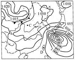(1)图中A天气系统不断向东偏北移动,使B城市出现了狂风暴雨的天气,试判断A天气系统为?,此时B城市的风向为?,B城市与D城市比较,风力较大的是?,判断理由是?。(8分)