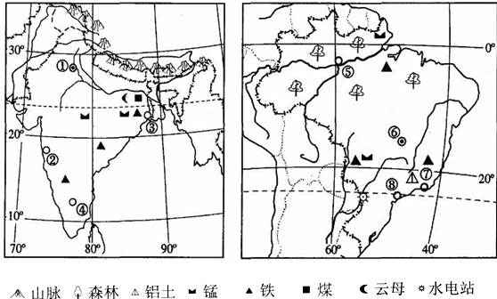 3、综合题 读南亚和南美洲最大国家的地理简图,并回答问题。(20分)
