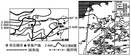 材料二:下左图为某区域年太阳日照时数图,图中A、B两地是我国重要的苹果产地,下右图为 A所在省份部分区域示意图。