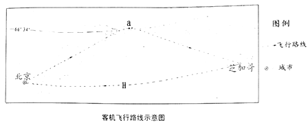 1、单选题 假设一架客机于北京时间6月21日18时从北京(116°E,40°N)起飞,14小时后途经a地(165°W,67°N)上空后抵达芝加哥(87.5°W,42°N)。