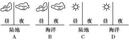 (2)B 多云的白天,大气对太阳辐射削弱强,气温低;夜晚,大气的保温作用强,气温高;再加上海洋的热容量比陆地大,升温、降温慢,所以昼夜温差大