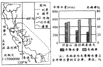 材料一下面左图是某国某州区域图,右图是三城市年降水量和冬雨率柱状图