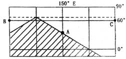 点评:本题难度中等,解答本题的关键是明确地方时的计算方法,借助晨线与赤道的交点地方时为6点来确定东经150度的地方时。明确过地心的大圆为地表最短路径。