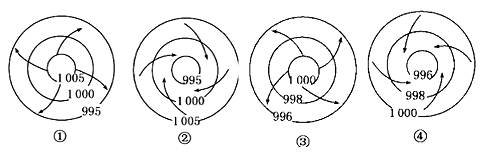 【小题1】台风是强烈发展的热带气旋,是低压中心,该台风位于北半球,近地面天气系统示意图是逆时针辐合,④对。影响台风路径的因素是地转偏向力,D对。