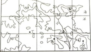 5、单选题  图为某地一段海岸地区的等高线(单位:米)示意图,比例尺为1:50 000,图中每一方格的边长为2厘米。读图完成下列各题。