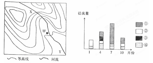 4、单选题 我国东北某地区等高线地形图及图中河流径流构成变化图,回答下面各题。