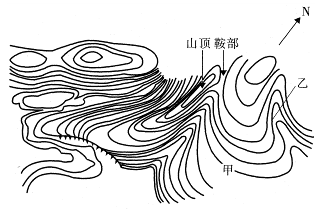 2、单选题 下图为北半球某地局部等高线地形示意图,甲处海拔800米,植被属常绿硬叶林,等高距为50米。读图完成下列各题。