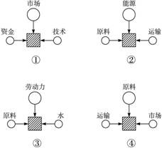 本题解析:本题主要考查了影响工业区位选择的主要因素。根据图中圆圈大小表示各因素对工业区位选择影响程度的强弱可知,①②③④四地的主导区位因素分别是市场、能源、劳动力、原料。啤酒厂因其产品运输不便,且在生产过程中消耗较多的是一种普遍性的原料——水,因此应布局在市场;炼铝工业属于有色金属冶炼,在其生产过程中需要消耗大量的能源,因此为了降低成本、提高效益,最理想的区位是位于能源丰富的地方;缫丝厂在生产过程中需要大量的劳动力,工资支出在其成本中占重要地位,因此应选择在劳动力资源丰富、工资水平较低的地区;榨糖厂的原料主要为甘蔗或甜菜,在由原料加工成产品的过程中,重量大大减轻,为了减少运费的支出,所以尽量在原料产地组织生产。