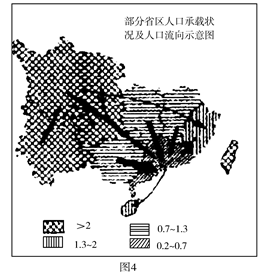 2、单选题  图4为“我国部分省区人口承载系数(实际人口密度与理论承载密度之比)及20世纪80年代下半期人口流动”示意图,据图回答9-11题。