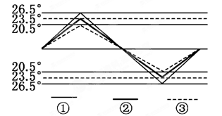 5、单选题 下图为太阳直射点的回归运动示意图(①③是两种假设, ①线纬度是26.50 ,②线纬度是23.50,③线纬度是20.50),读图完成题。