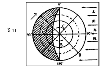 2、综合题 读图11,阴影部分表示夜半球,回答下列问题。(每空1分,共10分)