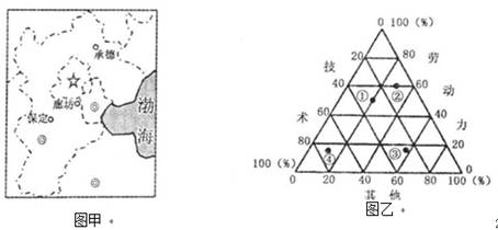 小题1:根据材料,将在廊坊打造以“研发创新——加工应用——传输发布”为特色的产业园区,研发创新属于高技术产业,乙图中只有④属于技术指向型产业,所以D对。①、②是劳动力指向型产业, ③是其它指向型产业,A、B、C错。