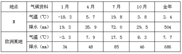 材料二 上图中N地与欧洲同纬度某地气候资料表。
