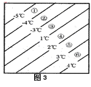 2、单选题 图3为“北半球某平原地区某日气温水平分布模式图”(图中等温线之间的距离相等),回答题。