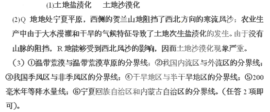 (2)两地荒漠化出现差异的原因:Q地地处宁夏平原,西侧的贺兰山地阻挡了西北方向的寒流风沙;农业生产中由于大水漫灌和干旱的气候特征导致了土地次生盐渍化的发生。由于没有山脉的阻挡,R地能够受到西北风沙的影响,因而土地沙漠化现象严重。