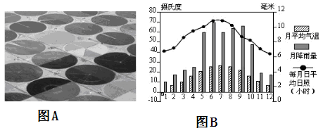 3、单选题 图A是飞机航拍土地利用图,圆圈内为农田。图B是该地气候资料图,完成下题。1.影响该地农田空间分布形态的最直接原因是2.影响该地每月日平均日照时间季节变化的最主要因素是