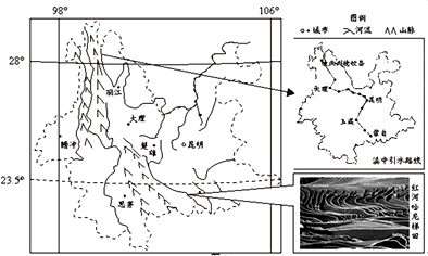材料一:图7为云南省区域图。云南红河哈尼梯田绵延整个红河南岸的元阳、绿春、金平等县,是当地人民利用自然条件创造的农耕文明奇观。