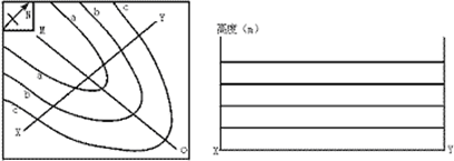 (2)若该图为等高线地形图,则OM为             。某地质考察队沿XY线考察。在a、b、c三处地层中分别发现了A最老、C最新,则该处的地质构造是