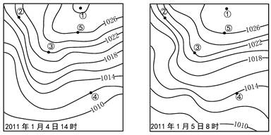 5、单选题 下图示意北半球某区域2011年1月4日14时和5日8时海平面气压(单位:百帕)分布,读图完成下列小题。