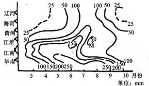 1、单选题 下图表示我国110°E以东地区月降水量变化情况,如果以月降水量大于100毫米为这一地区处于雨季的标志,请完成题。