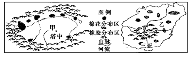 小题2:甲、乙两区域分别盛产棉花和天然橡胶,其共同的区位优势夏季热量充足;劳动力价格较低。