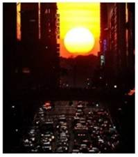 5、单选题  在某城市(40°43′N)主街道可看到旭日或夕阳位于街道正中间的景象。这种“悬日”景观的出现其实是自然与人工建筑的搭配。该图显示的是该街道某年5月28日日落“悬日”景象,据此完成问题。