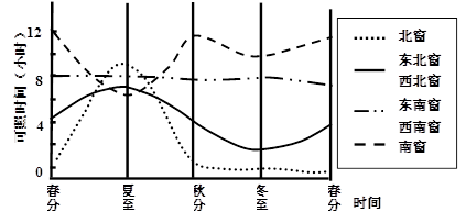 2、单选题  下图是300N地区几种朝向的窗户内每天可能受到太阳直接照射的时间曲线图。回答下列小题。
