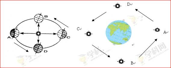 小题1:如下图,左图为地球公转图,假设地球无自转但公转不变,那就是地球表面各点在宇宙中的朝向不变,我们站在地球上看,把地球当做不动,看A、B、C、D四节气太阳所在地球的各个方位,如右图所示。在一年中,按地球公转顺序,在地球上看太阳依次位于右图中A-D-C-B-A各点,太阳视运动自西向东,一年中太阳西升东落。故选C。