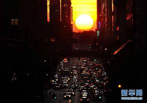 5、单选题 2011年5月30日,“曼哈顿悬日”奇观再度出现。“曼哈顿悬日”,是指在美国纽约曼哈顿(40°N,74°W)出现的一种自然现象。由于曼哈顿街道为严格的网格式布局,在每年的5月30日和7月12日前后,日落时阳光会洒满曼哈顿的所有特定朝向的街道,呈现出壮观的景象,如下图。回答问题。1.出现“曼哈顿悬日”现象的街道走向大致是2.这些街道日出时也会出现类似现象,出现的日期应该是