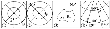 【小题1】从地球自转方向看,图①中地球自转方向为逆时针,显示为北半球俯视图,中心点为北极点,B在A的东南方;图②中地球自转方向为顺时针,显示为南半球俯视图,中心点为南极点,B在A的东南方;在图③中,仔细看指向标,B在A的东北方;图④的我经纬网图中,B在A的西南方。答案选A。