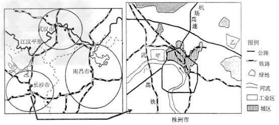 (2)株洲市有“火车拉来的城市”之称,说明________条件对城市的发展影响很大。若在株洲建一大型机车制造厂,你认为放在________(填甲或乙)工业园区较好。