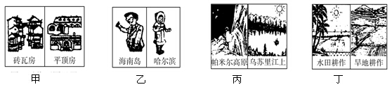 本题解析:甲图是我国南北方地区因为降水量有较大差异形成的不同民居房顶形态,而不是我国东、西部的不同民居,答案A错误,我国海南岛地处热带,一年中长夏无冬,图乙中海南岛服饰不正确,答案B错误,由于我国东西跨度较大,时间差异很大,当东部乌苏里江太阳升起的时候,西端帕米尔高原上还是满天星辰,丙图可以显示同一时刻,我国东、西部不同景象,故答案选C,丁图显示是我国南北方不同的耕作方式,故答案D错误。