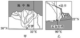 本题解析:1.根据两区域的经纬度位置和海陆位置判断,甲位于地中海沿岸,地处尼罗河三角洲是流水沉积作用形成的地形平坦主要种植棉花。而乙位于南亚地区,地处恒河三角洲是流水沉积作用形成的地形平坦主要种植水稻。甲为地中海气候乙为热带季风气候两地区的降水量都较丰富,故河流主要以雨水补给,但降水量的季节变化大。乙地位于印度洋与亚欧板块的交界处,但并不位于世界两大主要火山地震带上。
