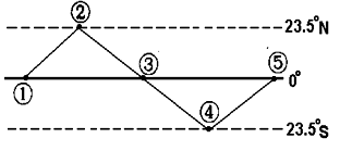 5、单选题  2007年10月24日18:05(北京时间),中国自己设计的“嫦娥一号”月球探测卫星发射升空,开始了太空旅行。阅读该图:太阳直射点周年变化示意图,回答问题。
